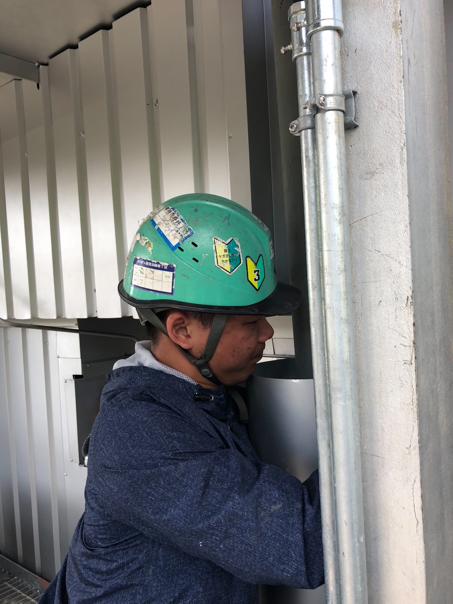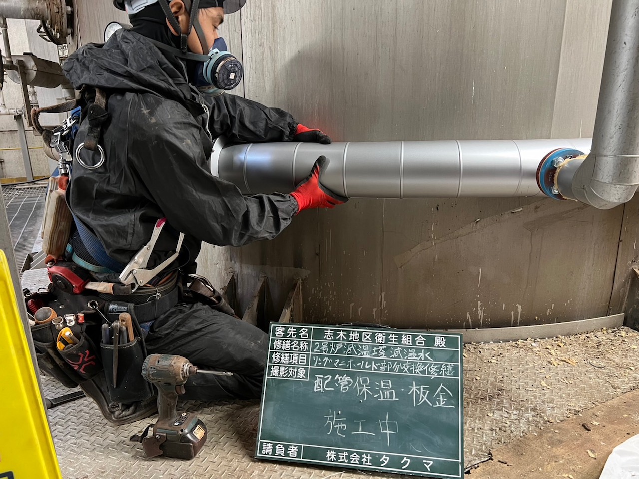 保温・保冷材を覆うための薄板鋼板を製作・取り付けする作業です。断熱材を外部からの衝撃や湿気から保護し、施工の耐久性や安全性を高める目的で行います。