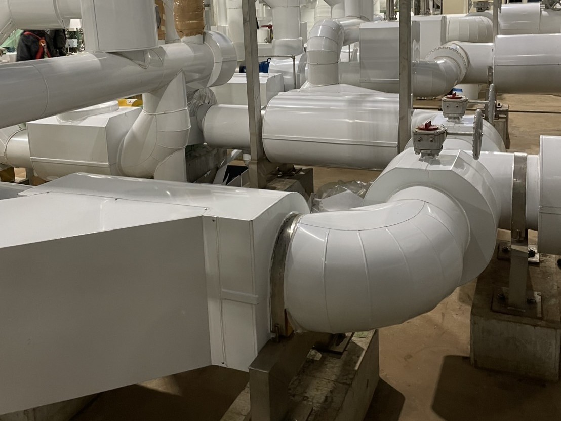 建設現場において、配管や機器、ダクトなどの設備に対し、断熱・保冷・防露・板金仕上げといった熱絶縁工事を一式で対応しています。